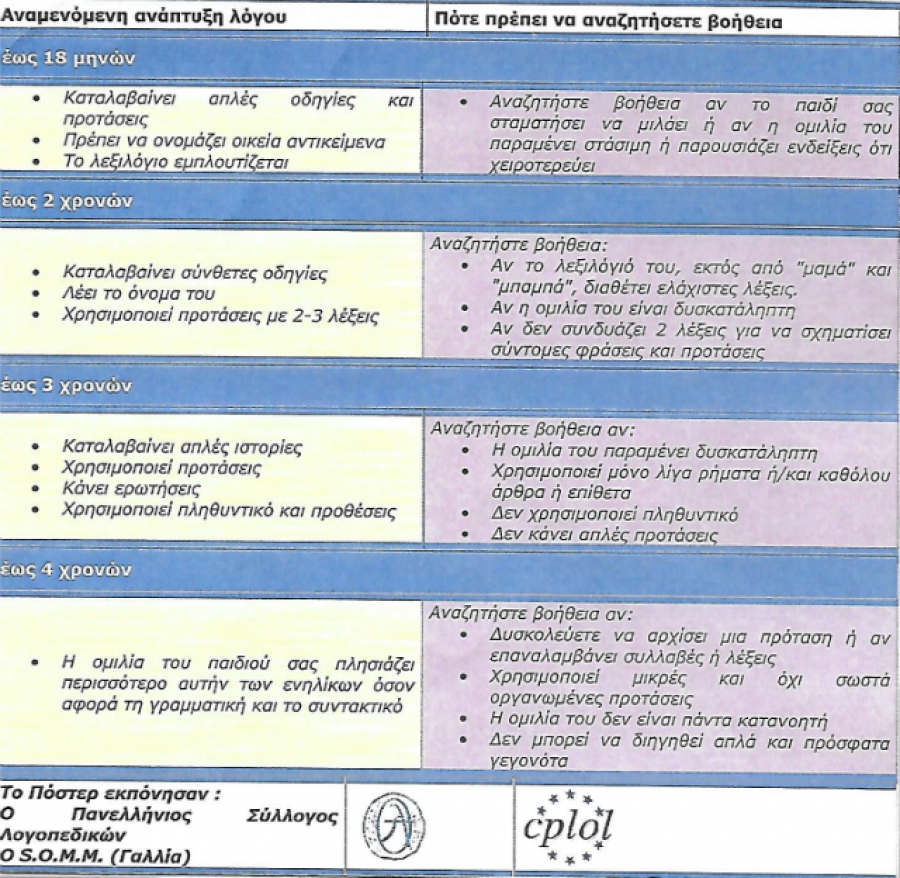Μπορείτε να παρατηρείτε την ανάπτυξη του λόγου των παιδιών σας και να ζητάτε τη βοήθεια των ειδικών αν κάτι σας ανησυχεί. Ο παρακάτω πίνακας θα σας βοηθήσει να παρατηρήσετε στα παιδιά την ανάπτυξη του λόγου και το πότε πρέπει να ζητάτε βοήθεια.